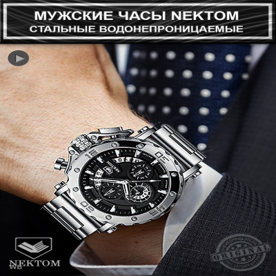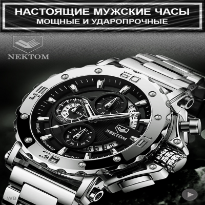 Новинка в мире часов от компании NEKTOM и WATCH-STORE. Наша большая команда является официальным представителем бренда NEKTOM в России.! Часы Мужские Наручные Nektom Quartz Silver/Black Pro это не просто наручные часы, но и идеальный Подарок Вашему Мужчине! Это память, которая всегда будет с ним. Эти модели часов для любителей по-настоящему крупных и массивных экземпляров. Цельнолитой! Браслет и Корпус Мужских Часов изготовлены из Нержавеющей Стали 316L. Сплав железа и хрома в составе стали 316L образует на поверхности защитный слой, обладающий высокими антикоррозийными показателями и особой устойчивостью к механическим повреждениям. Диаметр корпуса составляет 53 мм (шестиугольный циферблат) и 55 мм (круглый циферблат). Сердце часов - Японский Высококачественный Механизм. Всегда помни о времени, и о том, что оно быстротечно. Цени каждое мгновение, проведенное со своими любимыми и близкими людьми. Набирая скорость, не забывай про здесь и сейчас. Ведь синдром отложенной жизни затягивает и трудно отпускает. Пусть часы всегда напоминают тебе о том, что время не остановить ни на секунду. Наша коллекция часов для тех, кто не победил время, а смог подружиться с ним! Присоединяйся. Ведь мы, как талисман, приносим удачу и победу. Часы NEKTOM - это результат четко организованного производственного процесса, высококачественных материалов и швейцарских технологий. Эти мужские кварцевые наручные часы будут безусловно дополнять твой образ, доводя его до совершенства. Часы металлические наручные из стали - массивны, но при этом красивы, поступают к покупателю в подарочной коробке, с ключом для регулировки размера браслета, запасной батарейкой, тряпочкой для полировки . Отличный выбор для подарка любому мужчине, отцу, брату, коллеге, начальнику и просто другу. ГАРАНТИЯ 1 ГОД. Подчёркнуто Брутальный и Стильный Дизайн. Циферблат Черного и Серебряного Цвета с люминесцентными стрелками. Антибликовое закаленное Минеральное Стекло, устойчивое к механическим повреждениям и царапинам. Крупная апертура календаря в оригинальном дизайне по всей правой стороне циферблата. Три дополнительных функциональных Хронографа. Раскладная браслетная застежка "Бабочка". Водостойкость WR 30 (душ, дождь, брызги). Регулируемая длина Ремешка 22 см. Часы крупные! Вес 196 грамм. Обратная связь: info собака watchstorecom точка ru Обратная связь: info собака watchstorecom точка ru Наша компания имеет более чем десятилетний опыт непрерывной жизни и работы в Китае. Мы занимаемся логистикой, сертификацией и официальным таможенным оформлением товаров. Имеем собственные склады и русскоязычных сотрудников в китайских городах Иу и Гуанчжоу - центрах мирового производства. А также оказываем профессиональные и качественные услуги Фулфилмента (подготовки и сдачи товара на маркетплейсы) в Москве. Все этапы работы мы выполняем сами и полностью контролируем весь процесс. От закупки и проверки товаров в Китае, до упаковки и поставки их на склады маркетплейсов. Всё это позволяет в совокупности предложить наиболее лояльные цены и качественные товары для наших клиентов и покупателей. Но при этом, мы уважаем интересы наших коллег по площадке, и в этом претендуем на взаимность. WATCH-STORE - это лишь одно из направлений нашей работы. Но. Если наручные часы, то WATCH-STORE! Тэги: часы наручные мужские 14 февраля мужчине смарт подарок 23 папе подарки для муж